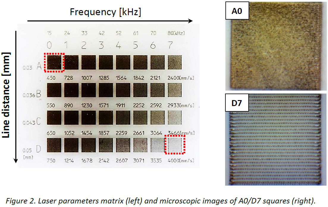 Figure 2 (left) presents a matrix which is typically used to optimize laser marking parameters. For the set laser power, we can vary laser frequency (x axis) and line distance (y axis). Laser marking speed is obtained by multiplying frequency by line distance. The higher the frequency and line distance, the higher the laser marking speed is and typically lower the laser marking contrast. Figure 2 (right) shows the differences between squares A0 and D7, as seen under microscope. A0 square is uniformly covered by carbonisation products, while D7 is dotted with small carbonized, well spaced-out spots.